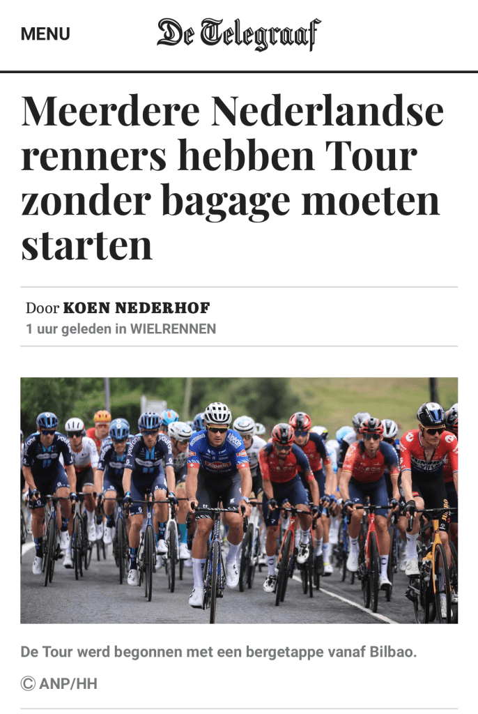 Met eerdergenoemde opgedane kennis was mijn verbazing dan ook groot bij het lezen van bovenstaand bericht in de Telegraaf van afgelopen zaterdag, over de zorg rondom de bagage van de Nederlandse Tour-de-France-renners die op Schiphol is achtergebleven. Niet zozeer verbazingwekkend dat er iets mis is gegaan op Schiphol… maar dat het ontbreken van de bagage de renners stress lijkt te bezorgen. Zij weten toch ook wel dat extra gewicht een succesvolle beklimming van de 3e categorie4 behoorlijk belemmert?
