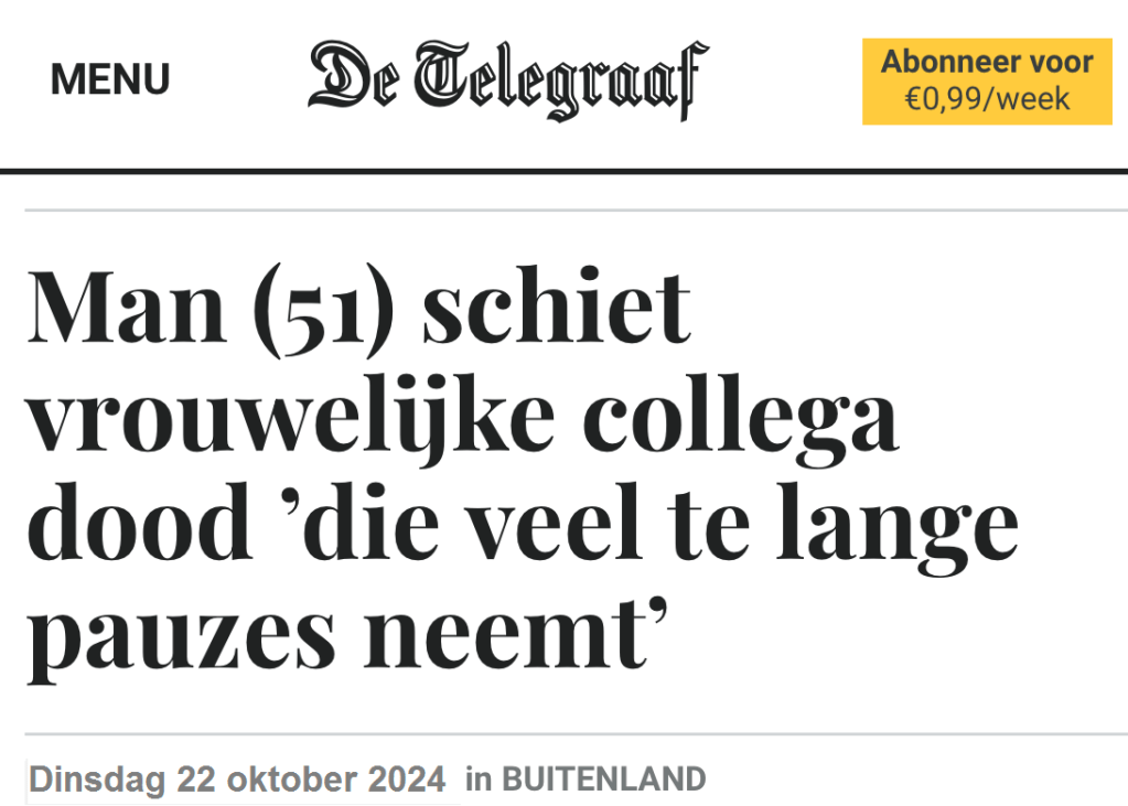 - 4 juli 2022 – plaats onbekend – Een werknemer, gedeprimeerd geraakt door het gedrag van zijn leidinggevende en collega’s en wiens verzoek om overplaatsing werd genegeerd, wachtte een collega buiten werktijd op en mishandelde hem dusdanig dat hij per ambulance moet worden afgevoerd.